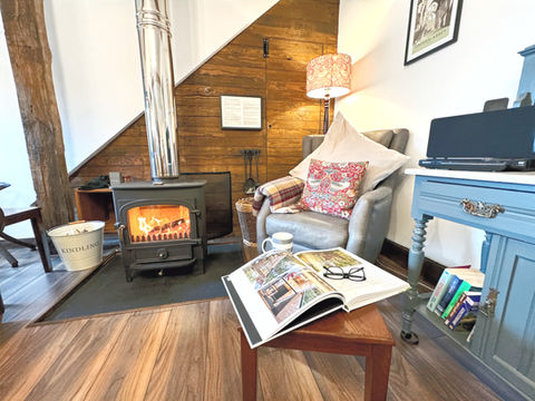 On entering The Studio Barn, a Lounger area with log burning stove stacked with logs awaits, look to the right where you will find an open plan kitchen, dining area, with induction hob and all the mod cons. Upstairs an open to rafters bedroom beckons with a super king sized bed, recycled furniture has been restored and updated.